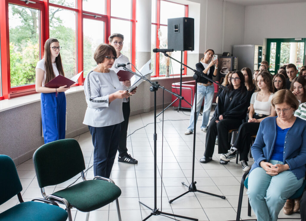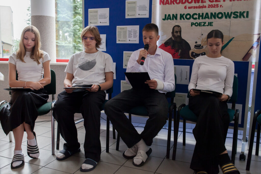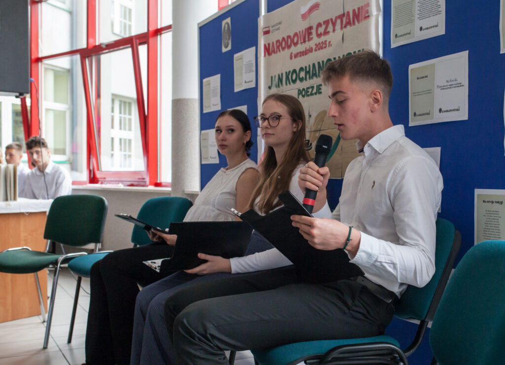 12 września w naszej szkole już po raz czwarty zorganizowano akcję Narodowego Czytania. Tym razem młodzież zmierzyła się z niełatwą, napisaną pięknym staropolskim językiem poezją Jana Kochanowskiego. Wśród czytanych tekstów znalazły się zarówno pieśni, fraszki, jak i treny. I choć z punktu widzenia współczesnego czytelnika język Kochanowskiego może się wydawać nieco archaiczny, to jednak tkwi w nim nieśmiertelne piękno, do czego próbowali przekonać słuchających czytający uczniowie. A z poezją Jana z Czarnolasu mierzyli się: Basel Al Ghazali, Gabriel Kowalczuk, Bartosz Skorupko, Anna Gruszkowska, Aleksander Stremkowski, Maria Stańska, Dominika Panasiuk, Wiktoria Różewicz, Alicja Radziszewska, Julia Sacewicz, Piotr Słowikowski, Iza Panasiuk, Urszula Owczarska, Sylwia Sadowa, Gabriel Sawczuk, Aleksandra Wincenciak, Michał Sywno. Do szkolnej odsłony Narodowego Czytania 2025 młodzież przygotowywała się pod okiem polonistki Ewy M. Iwaniak.