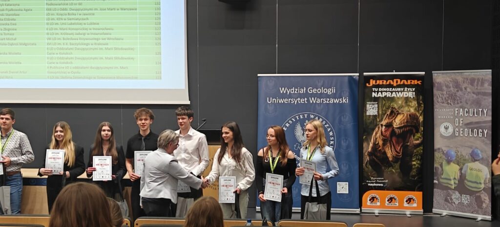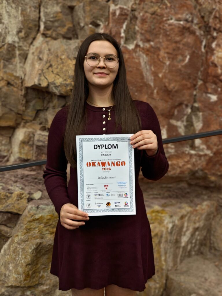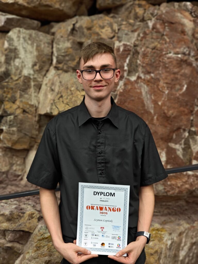 Z ogromną radością i dumą informujemy o sukcesie naszych uczniów w finale VIII Ogólnopolskiego Konkursu Wiedzy Geologicznej „OKAWANGO”, organizowanego przez Wydział Geologii Uniwersytetu Warszawskiego. Finał odbył się w dniach 23–24 marca w Europejskim Centrum Edukacji Geologicznej w Chęcinach.